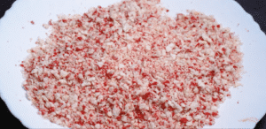 - Take the remaining breadcrumbs in a wide plate and add red food colour, mix well.